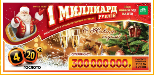 На этот Новый год всех участников лотерей ждет событие исторического масштаба — состоится розыгрыш более 1 миллиарда рублей. Стать его участником вы можете, купив билеты новогодних тиражей любой из 8 лотерей: «Гослото «5 из 36» спецвыпуск», «Гослото «6 из 45» спецвыпуск», «Гослото «7 из 49», Русское лото, Жилищная лотерея, «Золотая подкова», «6 из 36», а также нашей новинки — «Гослото «4 из 20».