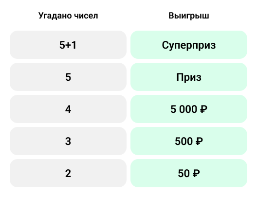 «Спортлото «5 из 36» и «клава» являются равнозначными коммерческими наименованиями лотереи «ВГЛ 1 Спорт», алгоритм определения выигрышей № 2, срок проведения лотерей — до 31.12.2029. Информацию об организаторе лотерей, о правилах их проведения, призовом фонде лотерей, количестве призов или выигрышей, о сроках, месте и порядке получения призов или выигрышей можно узнать на stoloto.ru или по телефону 8 900 555 00 55.