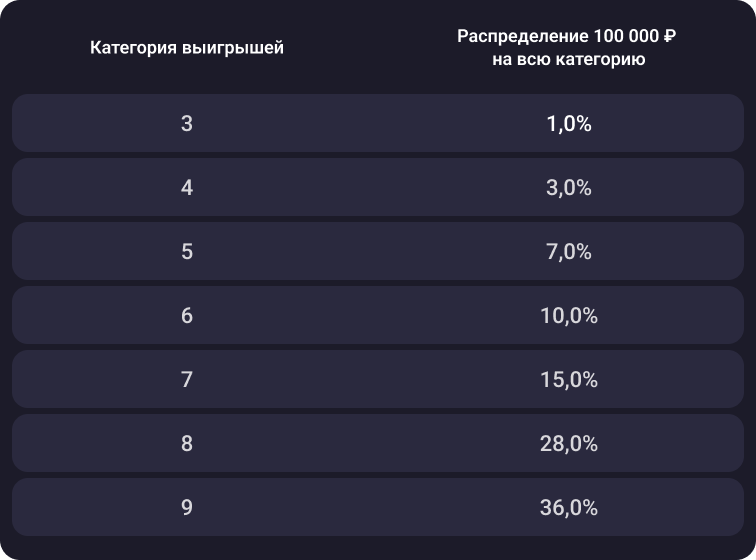 Подробнее о распределении 100 000 ₽ по категориям выигрышей смотрите в таблице.