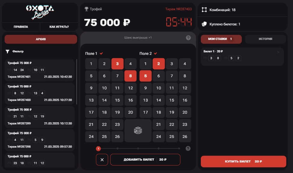 Крупнейший распространитель всероссийских государственных лотерей «Столото» запустил новинку на своем сайте stoloto.ru — еще один дизайн лотереи «Проще, чем дважды два» под названием «Охота. Вызов», для участия в которой участнику необходимо в каждом из двух полей билета выбрать по два числа из 26 и таким образом угадать выигрышную комбинацию.
