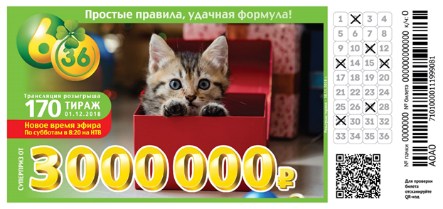| В билетах «6 из 36» одно игровое поле с 36 пронумерованными ячейками. Шесть чисел в билете уже зачёркнуты — это и есть игровая комбинация. Участнику нужно просто выбрать билет с понравившейся комбинацией и дождаться розыгрыша. |