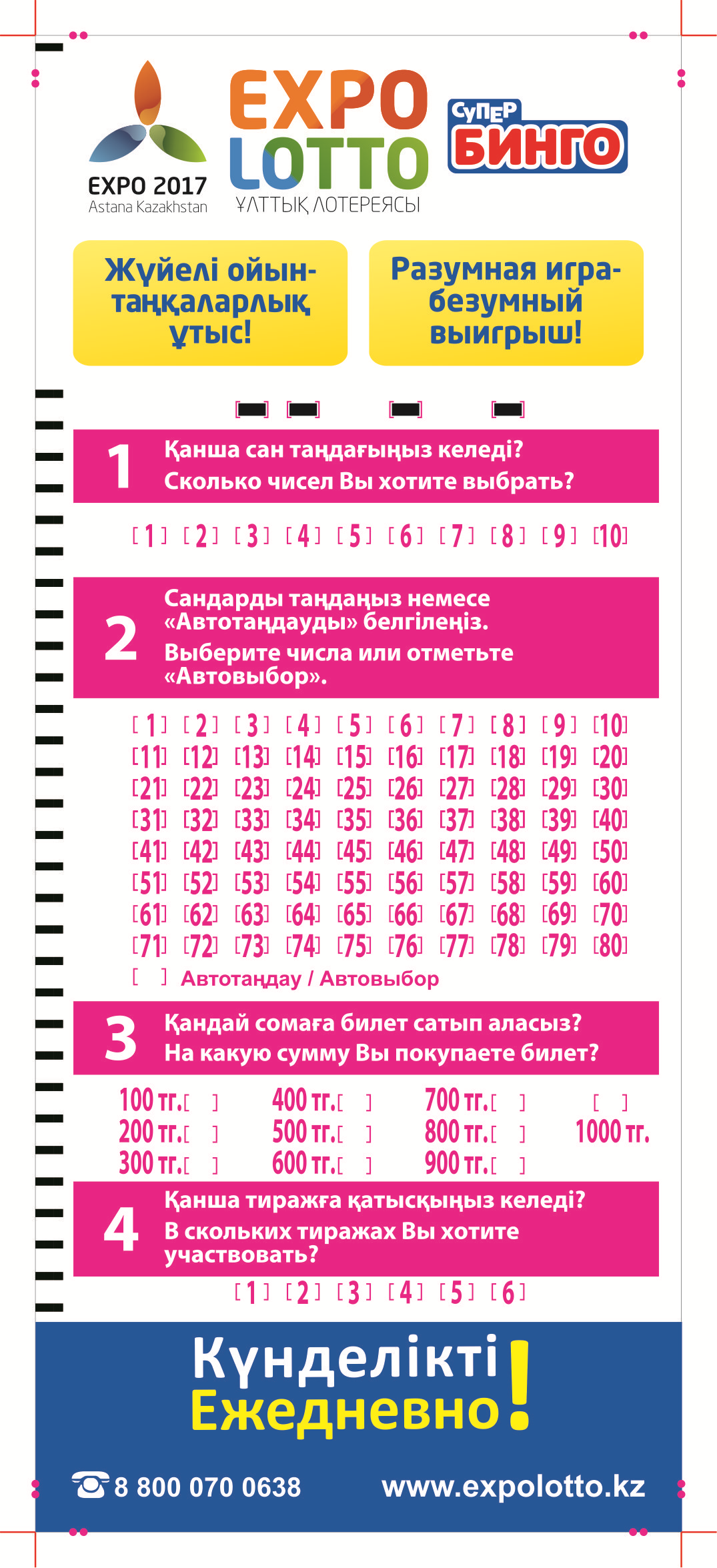 Стоимость одной ставки — 100 тенге. Розыгрыш проходит ежедневно.
