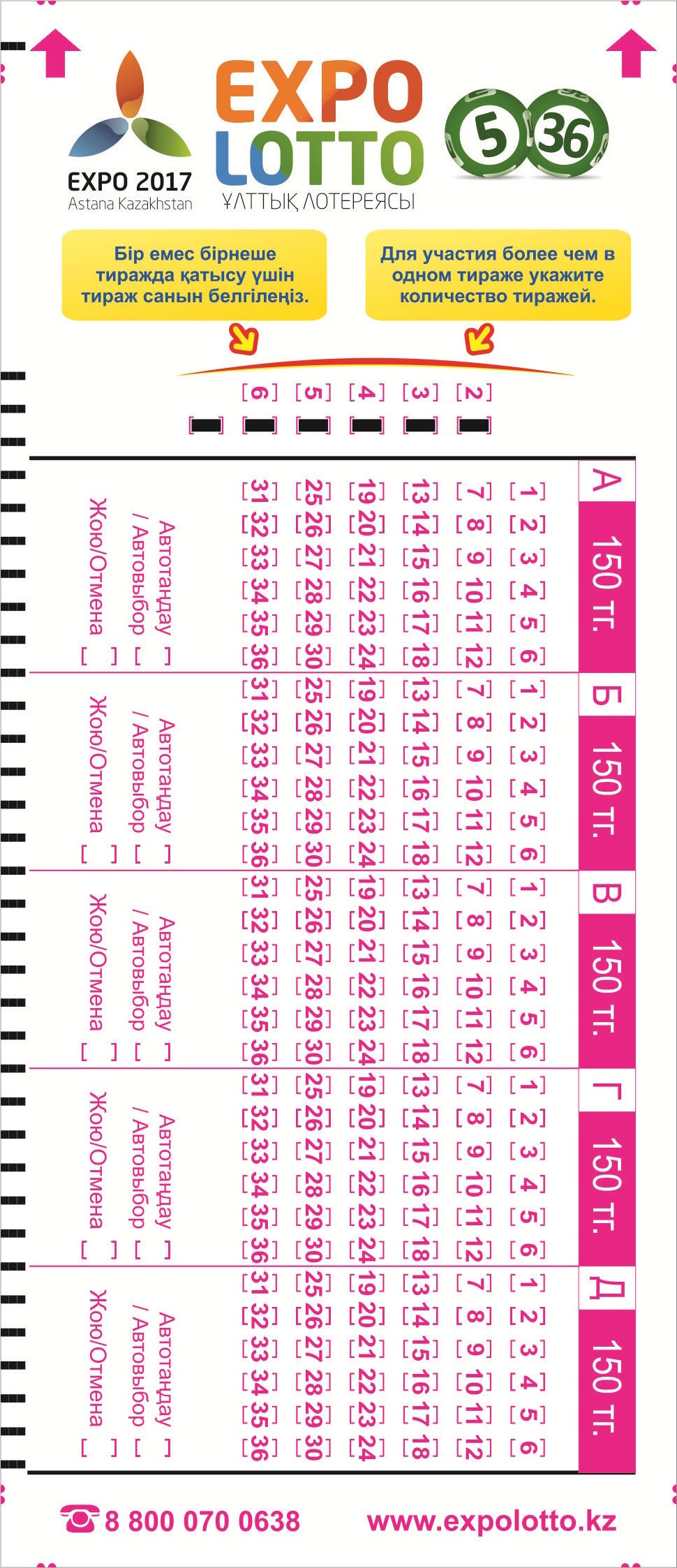 Стоимость лотереи по формуле «5 из 36» составляет 150 тенге. Принцип игры точно такой же, как у российской лотереи «Гослото «5 из 36». Розыгрыши проходят во вторник, четверг и субботу.