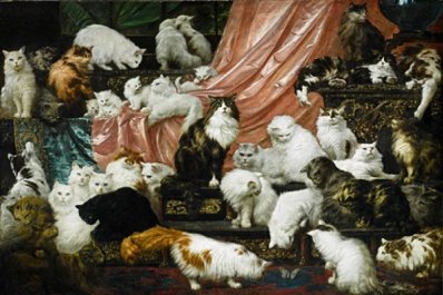Карл Калер написал картину в 1891 году по заказу Кейт Бердселл Джонсон, у которой было 350 кошек, живших в ее калифорнийском особняке. У каждого четвероногого было имя, а присматривали за ними многочисленные слуги.