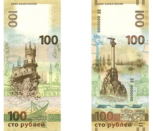 На одной стороне банкноты, посвященной Крыму, изображен замок Ласточкино гнездо. На другой — символ Севастополя, памятник затопленным кораблям, и фрагмент картины Айвазовского «Русская эскадра на Севастопольском рейде».