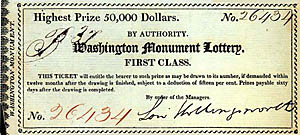 В 1809 году, через десять лет после смерти Джорджа Вашингтона, жители Балтимора обратились к Генеральной ассамблее штата Мэриленд за разрешением на проведение лотереи с целью привлечения средств для возведения монумента в честь первого президента США. Законодательная власть ответила быстро: в 1810 году юыло выпущено несколько видов лотерейных билетов. Участники получили возможность выиграть 750 000 при пересчете на курс 2015 года). Благодаря лотерее организаторы собрали для строительства монумента $100 000.