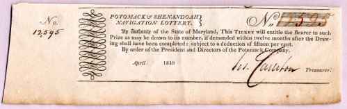 Билет лотереи Potomack & Shenandoah Navigation, которому уже более 200 лет, можно приобрести на аукционе за 400 долларов. Лотерея была организована для поддержки навигации на реке Потомак и упразднена в 1828 году.