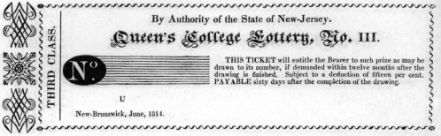 Лотерейный билет, распространяемый в Нью-Джерси в XIX веке. Часть суммы от продажи направлялась на финансирование Queen’s College (современное название — университет Rutgers) и Принстонского университета.