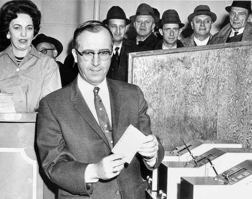На фото — исторический момент — губернатор штата приобретает первый билет государственной лотереи США. «Скорее всего, я — единственный покупатель лотерейного билета, который надеется не победить. Для меня это будет очень неловкий момент», — отметил Джон Кинг.