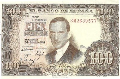 100 песет 1953 года. По курсу 2016 года — это 60 центов. Фото с сайта: ru.wikipedia.org