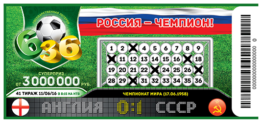 В преддверии чемпионата Европы для всех поклонников футбола запущена футбольная лотерея «6 из 36». В ее тиражах вы можете испытать удачу и побороться за суперприз от 3 000 000 рублей и узнать о победах сборных СССР и России на международной футбольной арене.