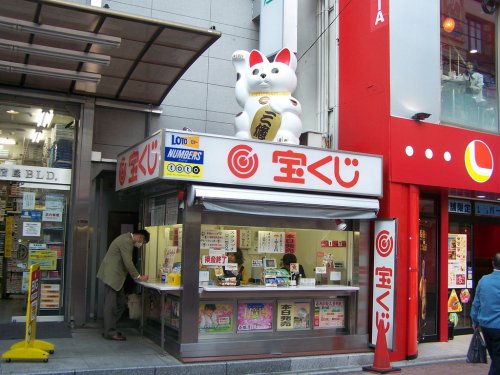 Кот с поднятой правой лапой на крыше лотерейного киоска приглашает участников испытать удачу. Источник sfw.so