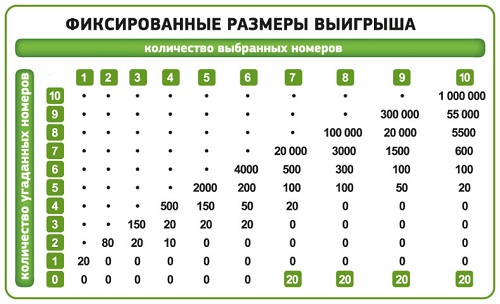 Кроме того, в «КЕНО-Спортлото» можно выиграть, даже если вы не угадали ни одного числа! Всего в лотерее 37 категорий выигрышей в диапазоне от 10 до 1 000 000 рублей. При использовании множителя сумма приза растет. Максимальный выигрыш в «КЕНО-Спортлото» с учетом множителя — 10 000 000 рублей.