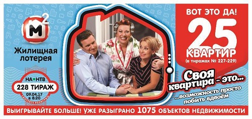 «Жилищная лотерея» на славу подготовилась к потеплению. В апреле вас ждёт квартирный марафон. В трёх тиражах (№ 227-229) будут разыграны 25 квартир! Чтобы увеличить свои шансы на победу, приобретайте билеты сразу на все тиражи марафона. Трансляции розыгрышей этих тиражей смотрите 2, 9 и 16 апреля в 8:20 на канале НТВ, в телешоу «Счастливое утро».