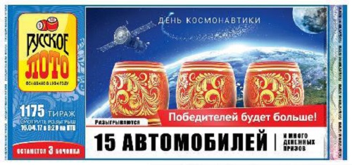 «Русское лото» приготовило для вас призы на любой вкус, а победителей в апреле будет больше обычного! В трёх тиражах (№ 1174-1176) подряд шансы на выигрыш будут выше — ведь в каждом из них в мешке ведущего останется всего 3 бочонка. Итак, в 1174-м тираже вас ждут 7 квартир, в 1175-м — 15 автомобилей и, наконец, в 1176-м — 15 призов по 500 000 рублей. Смотрите трансляции 9, 16 и 23 апреля в 8:20 на канале НТВ, в телешоу «Счастливое утро».