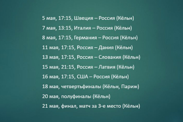 Мы же ни секунды не сомневаемся в том, что лучшей хоккейной сборной является сборная России. Именно поэтому, как и все болельщики, будем внимательно следить за ходом матчей с участием нашей команды. Если не хотите пропустить ни одной игры, скопируйте себе расписание.