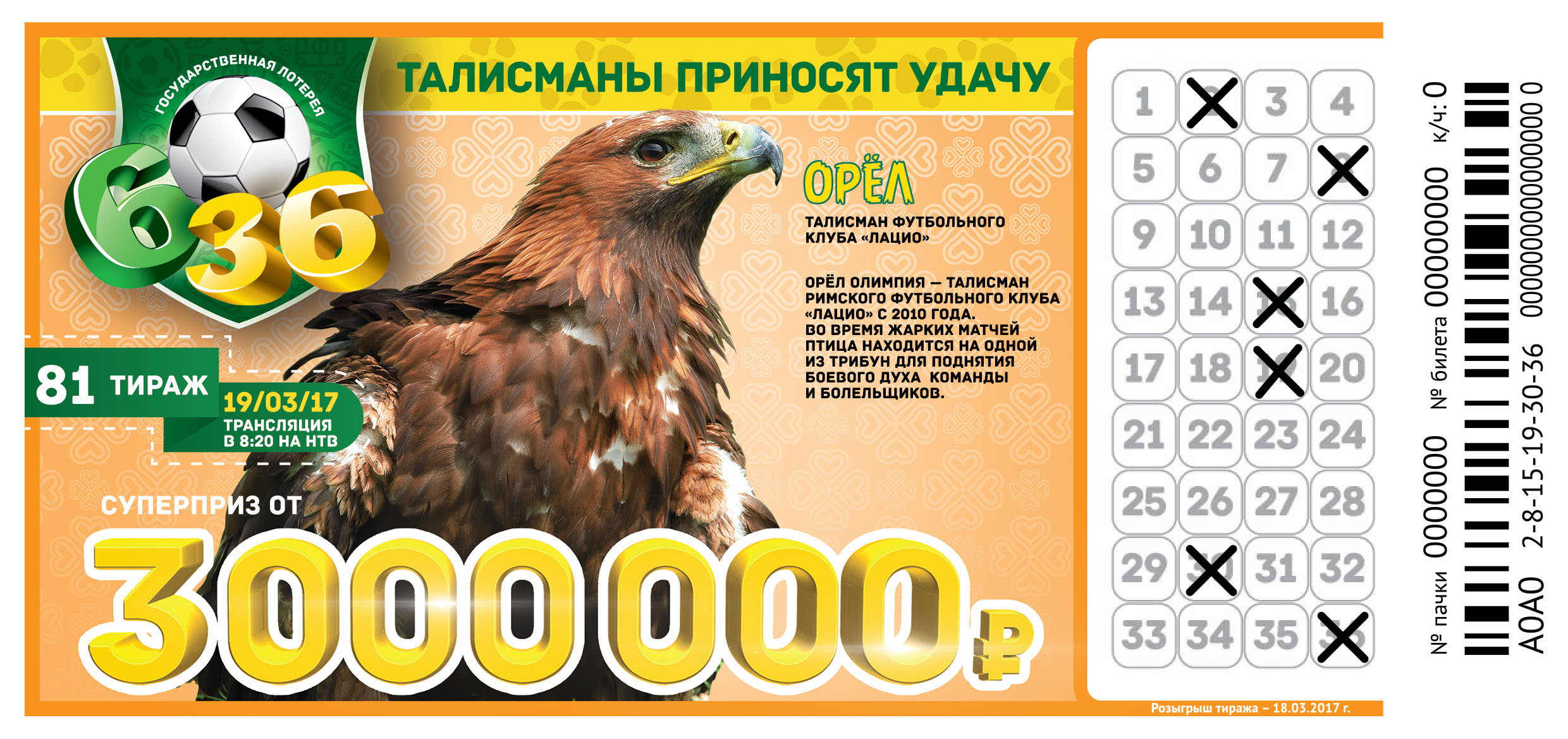 На билетах «6 из 36» в разное время публиковались изображения легендарных футболистов и животных-талисманов футбольных команд.