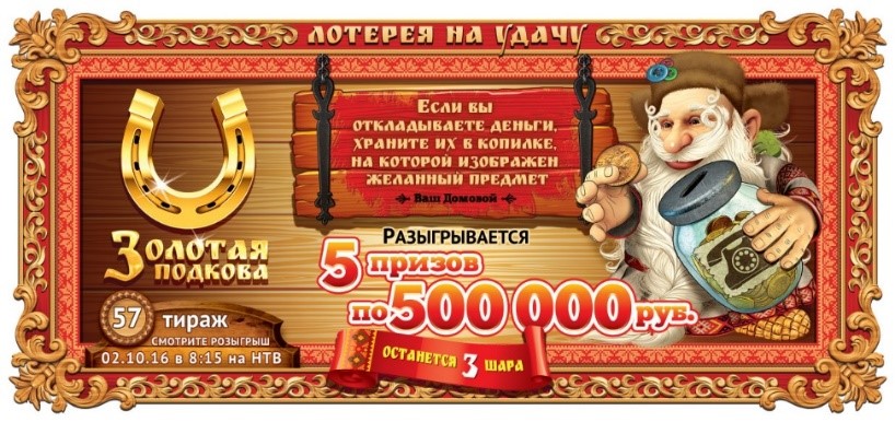 На билетах «Золотой подковы» каждый раз можно найти новую примету, которая привлечет удачу и прибыль. Например, чтобы год был удачным, посадите под ёлку символ года — петуха.