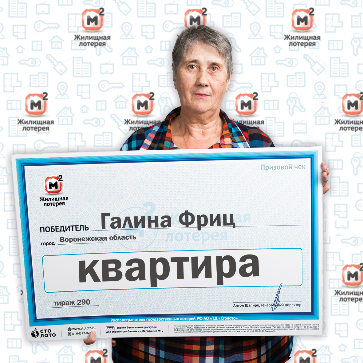 Организаторы лотереи огласили имя счастливчика из Воронежской области, который выиграл в 290-м розыгрыше «Жилищной лотереи» в июне квартиру за 1,7 млн рублей. Обладателем «золотого» билета стала Галина Фриц.