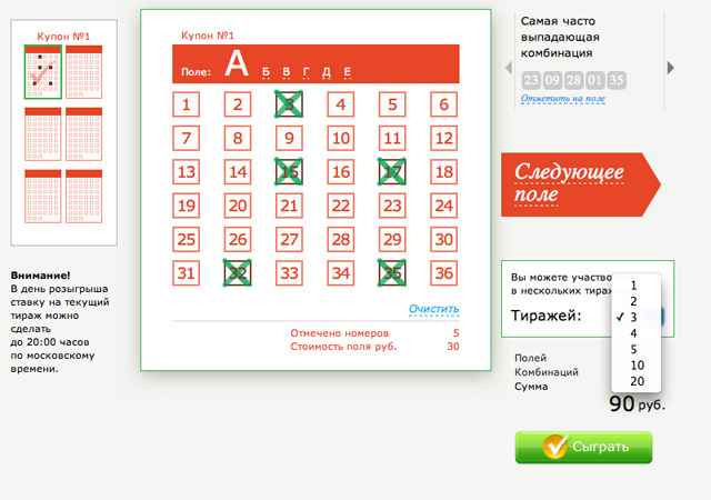Чтобы оформить ставку на несколько тиражей, нужно выбрать числа и в поле «Количество тиражей», которое находится между кнопкой «Следующее поле» и кнопкой «Сыграть», выбрать количество тиражей.