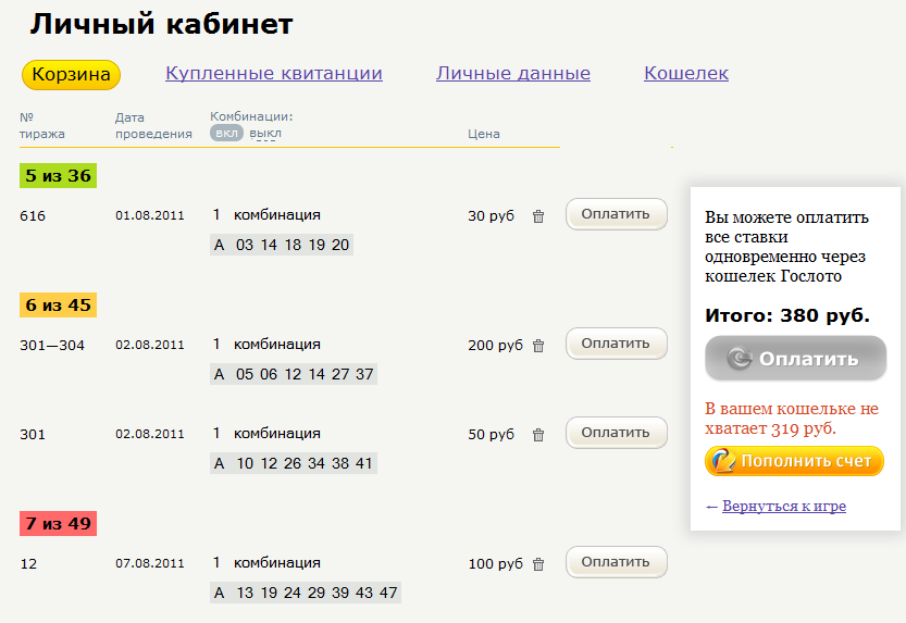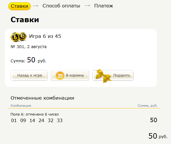 Общий ход оформления ставки прежний, только после заполнения игрового купона на странице проверки выбранных чисел вы нажимаете кнопку «В корзину» вместо привычного «Далее», и переходите либо к оплате, либо к новому игровому купону.