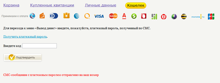 С 30 июля 2012 года для входа в меню вывода средств из Кошелька вам нужно будет вводить специальный платежный пароль, который по вашему запросу будет приходить по СМС на номер телефона, который вы указали при регистрации личного кабинета.
