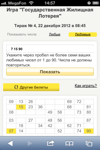 Чтобы выбрать любимые числа, нажмите ссылку «Любимые» и введите от 1 до 7 чисел от 1 до 90 через пробел, а затем кнопку «Показать».