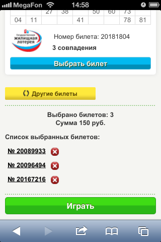 Чтобы поместить билеты в корзину, нажмите «Играть» в нижней части страницы, проверьте билеты — и оплатите из Кошелька.