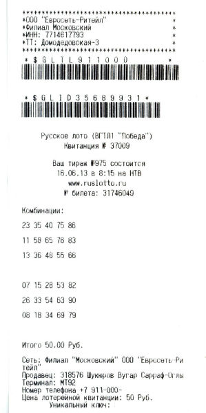 Продавец спросит у вас номер мобильного телефона, отсканирует ваш игровой купон и передаст вам квитанцию, на которой будут указаны номер и дата тиража, ваш мобильный телефон, а также те же самые числа, что и на купоне.