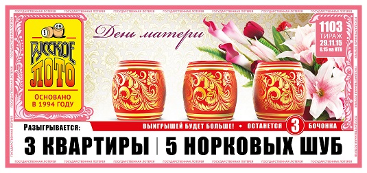 В праздничном 1103-м тираже Русского лото мы разыграем 3 квартиры и... 5 норковых шуб! Отличные подарки к началу зимы. Но это не все сюрпризы! Специально ко Дню матери в конце розыгрыша в мешке Михаила Борисова останется всего 3 бочонка! Что это означает? Только то, что в 1103-м тираже выиграет каждый третий билет!