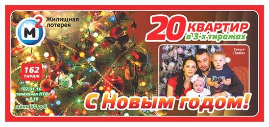 Жилищная лотерея от всего сердца поздравляет вас с Новым 2016 годом! Мы желаем вам успехов во всем, особенно в нашей лотерее. Желаем вам как можно скорее выиграть у нас квартиру и весело отпраздновать новоселье. В честь новогоднего торжества мы приготовили для вас специальное тиражное предложение: 20 квартир в трех тиражах — с 162-го по 164-й!