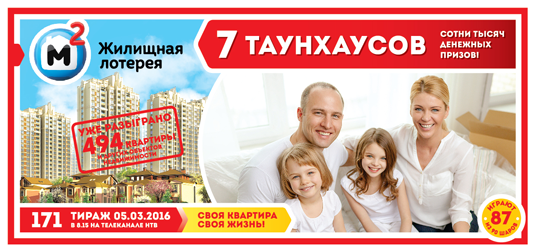 Зима длилась 91 день. Это много. Это долго. Поэтому мы с особенной радостью анонсируем первый весенний тираж Жилищной лотереи! И с особым трепетом представляем призы 171-го розыгрыша. Итак, 5 марта вас ждут 7 таунхаусов, сотни тысяч денежных призов и игра до 87-го хода. Выиграет каждый третий билет!*