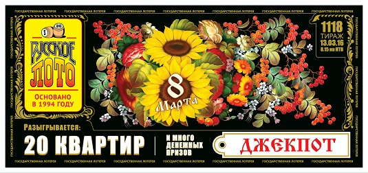 Вы уже решили, что подарить женщинам? Вопрос это непростой. Однако Русское лото знает, как порадовать прекрасную половину. В праздничном 1118-м тираже мы разыграем 20 квартир и Джекпот! Выигрыши всех победителей возрастут. Тем более что Джекпот лотереи превысил 40 миллионов рублей.