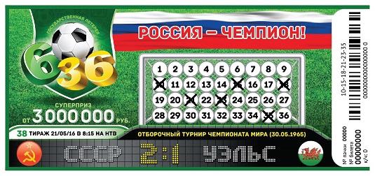Информацию об этих играх вы найдете на билетах 38-го тиража лотереи «6 из 36». СССР — Уэльс или Россия — Уэльс. Какую победу выберете вы? Приобретайте билеты в лотерейных киосках города и на сайте stoloto.ru.