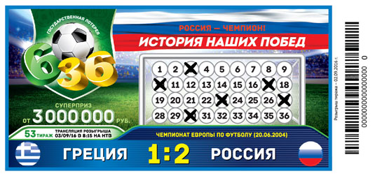 Запоминающиеся победы могут случится с каждым. Ваша победа вполне может найтись в футбольной лотерее «6 из 36»! В 53-м тираже традиционно выигрывает каждый 4-й билет, а суперприз составляет 3 миллиона рублей.