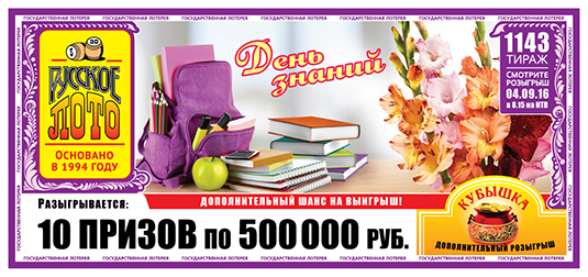 Русское лото, как прилежный ученик, уже вовсю готовится ко Дню знаний! Мы приготовили целый портфель подарков, которые будем раздавать в 1143-м тираже, посвященном этому радостному празднику. Вас ждет: