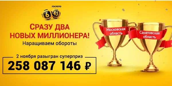 Сенсация! В 2414-м тираже «Гослото «6 из 45», который состоялся вечером 2 ноября, разыгран суперприз! Это случилось уже в 4-й раз за 2016 год. Вот это везение, вот это удача! Размер суперприза поражает воображение: 258 087 146 рублей. А самое удивительное то, что всю эту сумму... разделят двое! Да, два наших участника смогли угадать счастливую комбинацию (20, 21, 45, 5, 10, 42), и теперь они — мультимиллионеры.