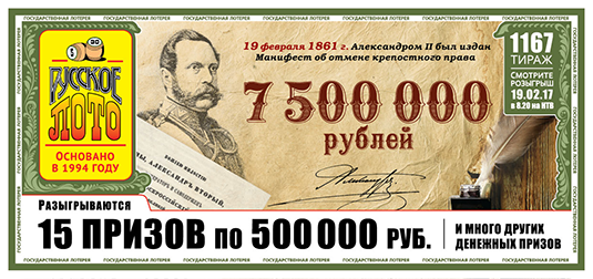 Этот день для вас. Знаете ли вы, что в 1167-м тираже Русского лото, трансляция которого состоится 19 февраля, мы разыграем 15 призов по 500 000 рублей? А если за первые 15 ходов в вашем билете совпадут 15 чисел, вы выиграете Джекпот лотереи — 100 000 000 рублей. Такой выигрыш изменит вашу жизнь навсегда.