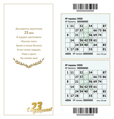 Вы все еще думаете, что подарить мужчинам? Лучший подарок к 23 Февраля — билеты Русского лото. Приобрести праздничные открытки вы можете в лотерейных киосках города и отделениях Почты России. Успейте взять: количество ограничено.