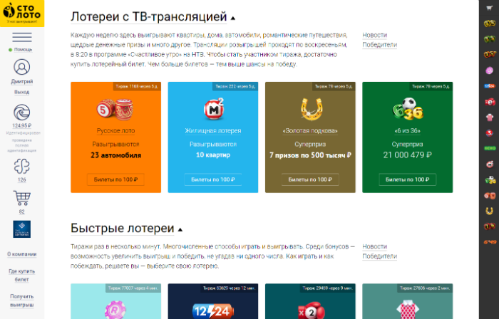 Теперь найти нужную лотерею стало просто. На главной странице есть три больших блока: лотереи с многомиллионными выигрышами («Гослото «4 из 20», «Гослото «5 из 36», «Гослото «6 из 45», «Гослото «7 из 49», «Спортлото 6 из 49»), лотереи с ТВ-трансляцией (Русское лото, Жилищная лотерея, «Золотая подкова», «6 из 36») и быстрые лотереи («Рапидо», «Топ-3», «КЕНО-Спортлото», «12/24», «Дуэль», «Прикуп»).