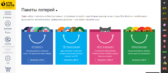 А ниже вы найдете специальный блок с пакетами лотерей. Пакет — это несколько билетов самых популярных лотерей, который даст вам еще больше шансов на выигрыш. Всего их четыре: «Стратег», «Миллионер», «Профессионал» и «ТВ-трансляции».