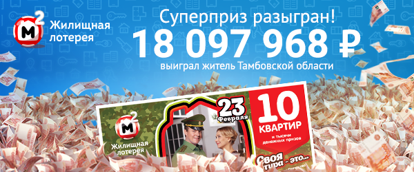 В воскресенье, 26 февраля, в эфире НТВ состоялась праздничная трансляция 222-го тиража Жилищной лотереи. На розыгрыш были куплены 1 168 139 билетов. В одном из них на пятом ходу совпали пять чисел одной из горизонтальных строк — 36, 46, 68, 26, 72. Владелец этого билета выиграл 18 097 848 рублей (суперприз лотереи и приз 1-го тура).
