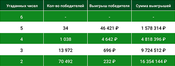 Шесть чисел не угадал никто, а значит накопленный суперприз 18 490 500 рублей был прибавлен к призовому фонду тиража. Всего между победителями тиража было распределено 32 475 366 рублей. Выигрыши увеличились!