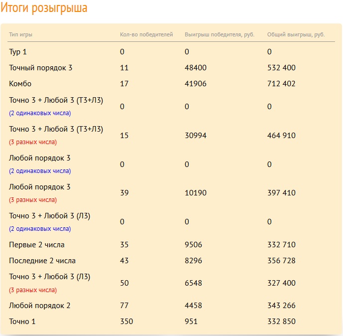 Всего в распределительном тираже участвовало 26 493 билета, или 42 776 комбинаций. Общая сумма всех выигрышей составила 3 800 076 рублей. Мы поздравляем победителей и приглашаем участвовать в следующих тиражах «Топ-3», которые проходят каждые 15 минут, а минимальный гарантированный суперприз составляет 15 000 000 рублей.