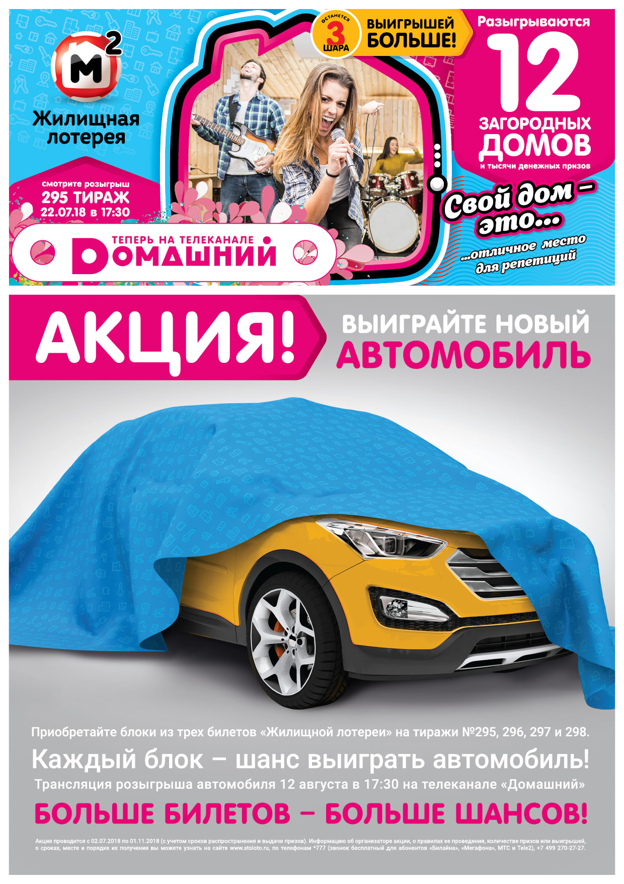 В четырех тиражах «Жилищной лотереи» — с 295-го по 298-й — мы разыграем 22 дома, 10 коттеджей, 10 квартир, тысячи денежных призов, а также проведем акцию с розыгрышем автомобиля. Участвуйте — это ваш шанс выиграть!