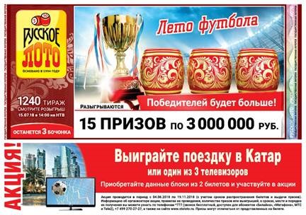 15 призов по 3 000 000 рублей, а также поездка в Катар и 3 телевизора по акции «Лето футбола» от «Русского лото»