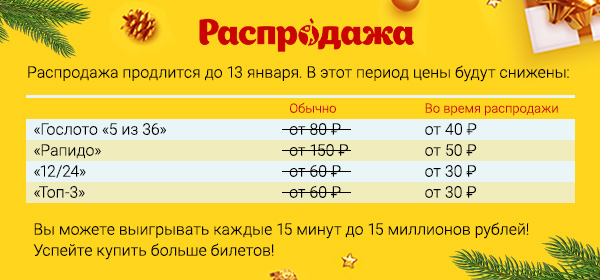 С 1 по 13 января, в тиражах с 9614-го по 9678-й минимальный гарантированный суперприз «Гослото «5 из 36» будет составлять 1 миллион рублей. Минимальный гарантированный приз «Гослото «5 из 36», а также минимальные гарантированные суперпризы «Рапидо», «12/24» и «Топ-3» в период распродажи не изменятся.