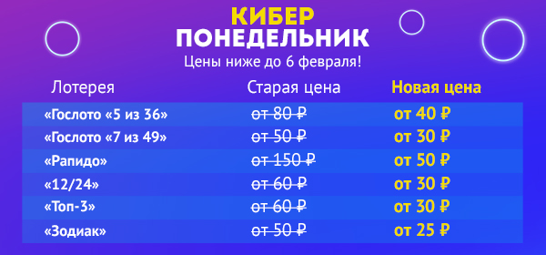 Всем-всем-всем! Мы продлили киберпонедельник до 6 февраля. Это значит, что впереди — еще неделя, когда цены на билеты 6 лотерей будут снижены: в «Гослото «5 из 36», «Гослото «7 из 49», «Рапидо», «12/24», «Топ-3» и «Зодиаке».