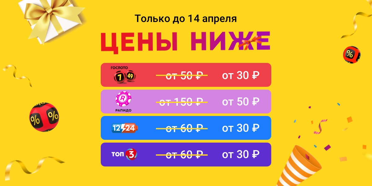 Скоро сайту Столото исполнится 9 лет. Чтобы отпраздновать это событие, мы снижаем цены в четырёх лотереях с 1 до 14 апреля. Не упускайте момент, запасайтесь билетами. Выигрывайте 15 миллионов рублей каждые 15 минут!