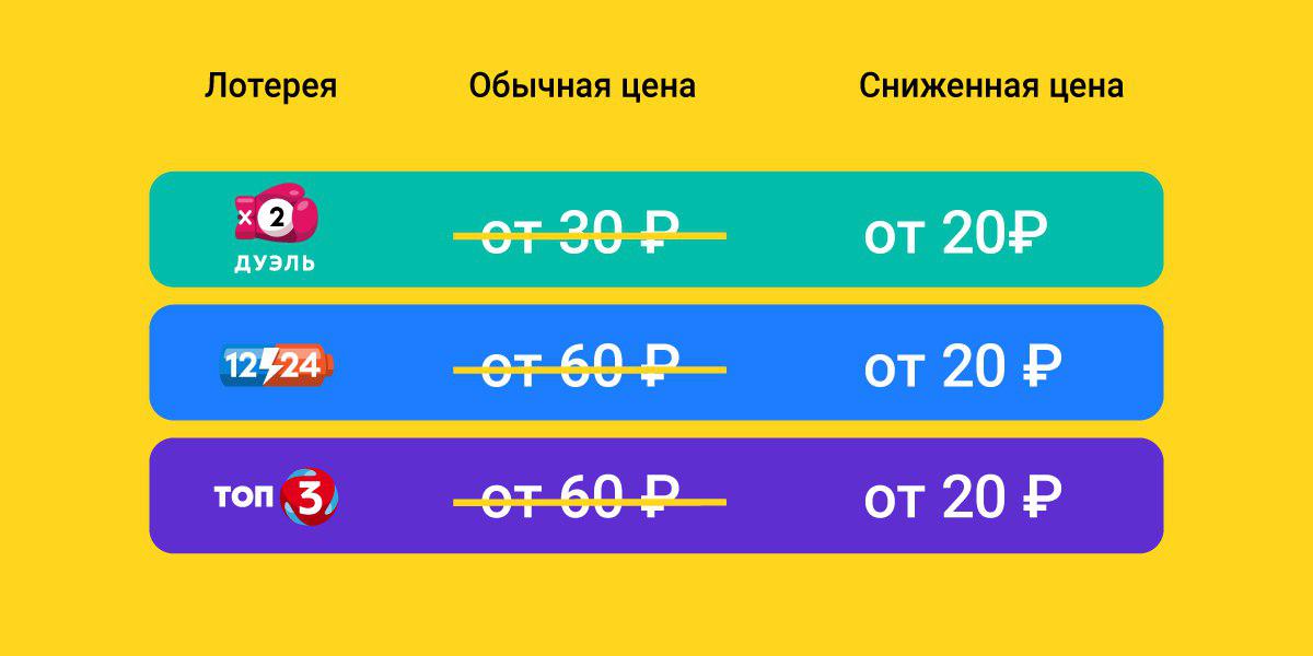Спешите принять участие в лотереях «Дуэль», «12/24» и «Топ-3» на выгодных условиях. С 18 сентября в этих лотереях снижены цены: билеты — от 20 рублей. Отличный момент, чтобы побороться за крупные призы: купите больше билетов, так у вас будет больше шансов. Дерзайте!